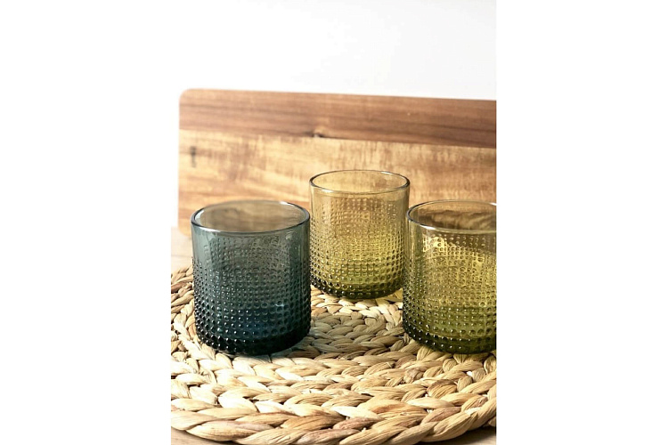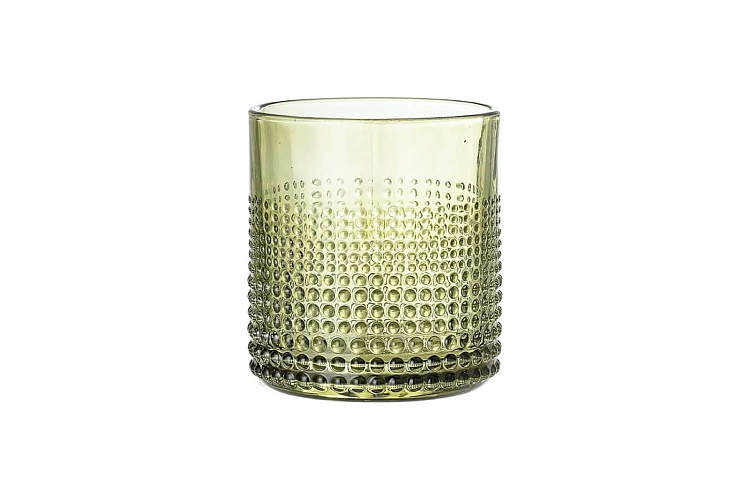 Стеклянный стакан из зеленого стекла. Фактурные точки позволяют его легко удерживать даже детям. Объем 300 мл. D8xH8,5 см.