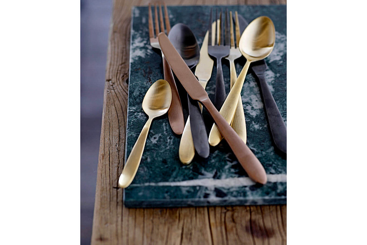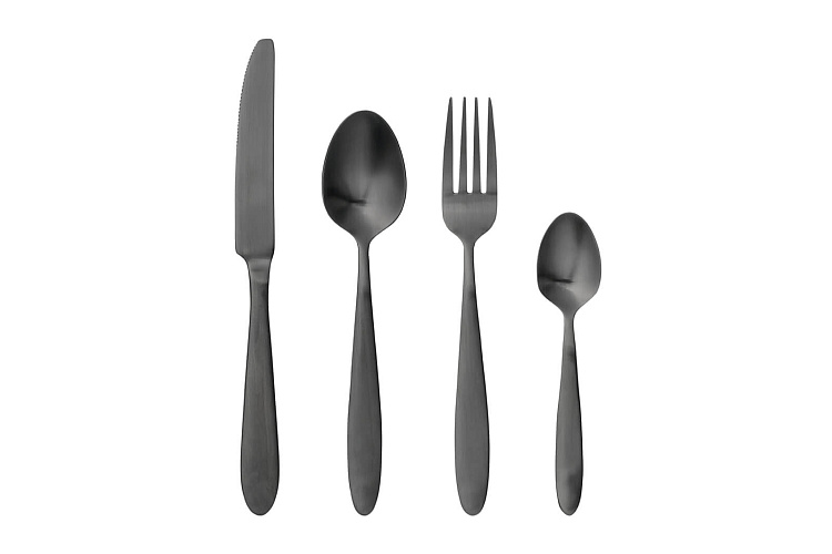 Набор современных столовых приборов из нержавеющей стали характеризуется матовой черной отделкой, которая прекрасно сочетается как с белой посудой, так и с белой скатертью или естественным цветом деревянной столешницы. Можно мыть в посудомоечной машине. Размеры: Нож :L22,5/Ложка:L20/Вилка:L19,4/Чайная ложка:L14,5 см