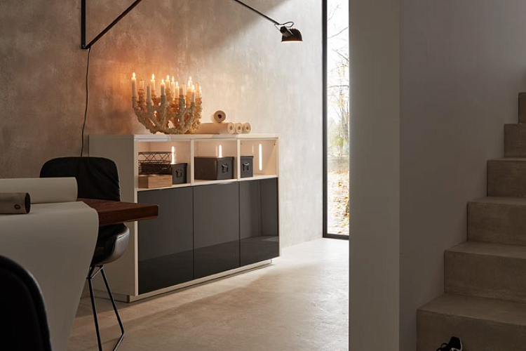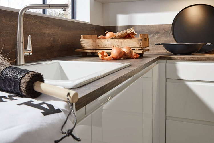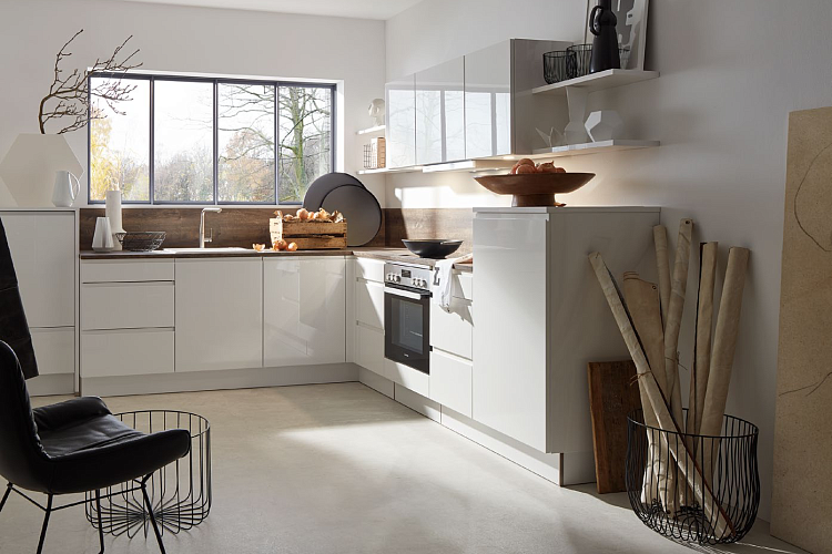 Несмотря на компактные размеры, эта кухня создает ощущение щедрого пространства. Помимо отказа от классических ручек, это также объясняется отсутствием каких-либо высоких шкафов и бытовых приборов от пола до потолка.