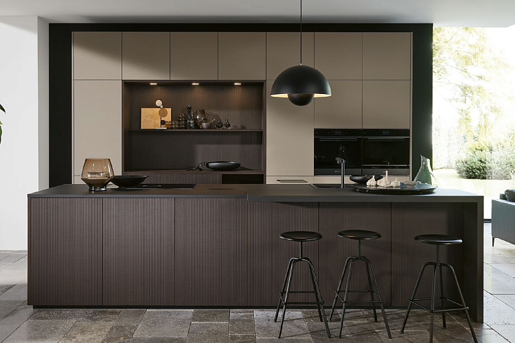 С рифлеными деревянными фасадами ARTLINE в полосатом кофейном цвете вы демонстрируете острое чувство тенденций и духа времени. Этот декор привносит разнообразие и индивидуальность в вашу кухню. Контраст между темным тоном дерева и PLUS в лавовом мягком мате с поверхностью, не оставляющей отпечатков пальцев, создает интересную визуальную динамику, сохраняя при этом гармоничный вид. Коммуникативный центр — кухонный остров, приглашающий к социальному взаимодействию с друзьями и семьей.