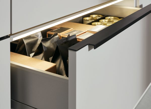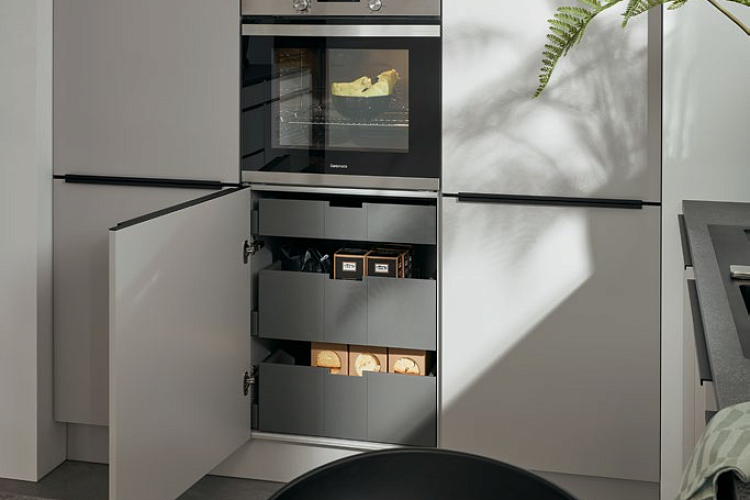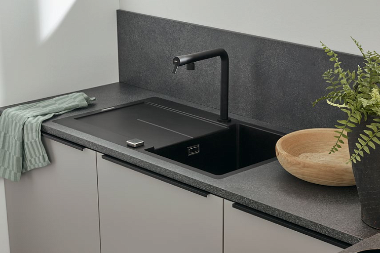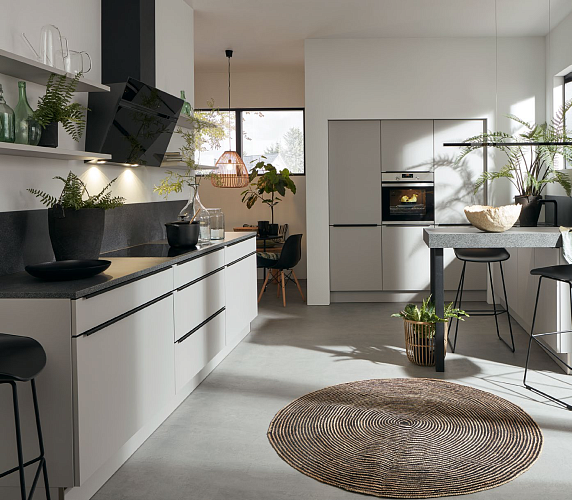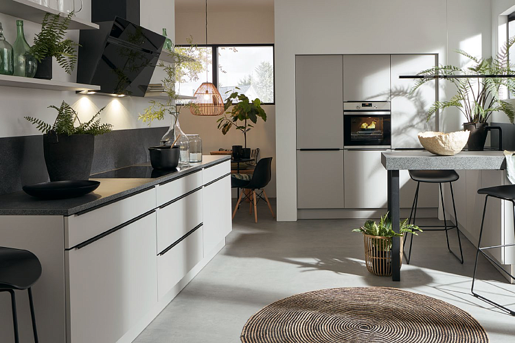 Темный натуральный камень, светло-серые фасады и минималистские ручки придают этой кухне вневременную элегантность. К этому следует добавить и другие детали, такие как мойка вровень с полом и встроенный в стену блок для электроприборов и хранения. А с добавлением небольшой барной стойки вы создадите комнату, которую не захочется покидать в спешке.