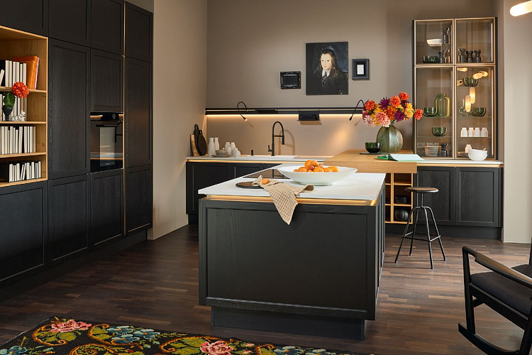В нашей концепции матового лака различные стили дизайна и актуальные цветовые тенденции объединяются, чтобы сформировать гармоничное единство. Для еще большей гибкости вы теперь можете спланировать кухню без ручек в стиле кантри: наши рамные фасады LUGANO LACK и FRAME LACK являются первыми в нашем ассортименте, предлагающими такую возможность. Этот LUGANO LACK в черном мягком матовом цвете идеально дополняет высококачественное сочетание материалов, таких как дерево, стекло, керамика и металл. С нетерпением ждем уютных часов на кухне, которая стильно сочетает дизайн и функциональность.