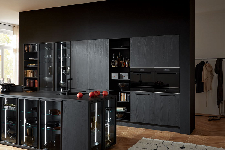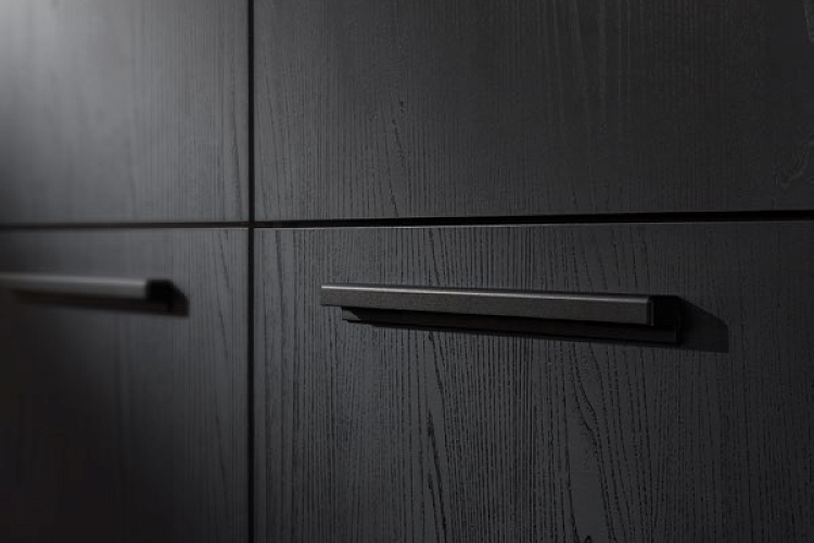 Новый MANHATTAN дуб nero создает сбалансированное сочетание уюта и вневременной элегантности с его выразительной текстурой поверхности, которая в зависимости от падения света меняется от глубокого черного до мягкого серого. Черные электроприборы, витрины с черными анодированными алюминиевыми рамами и черным тонированным стеклом, черная столешница и черная мойка с соответствующим смесителем придают этой кухне особенно элегантную ауру.