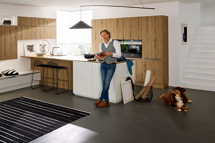 Фасад MANHATTAN из вулканического дуба обеспечивает смелые контрасты. Его отличительный декор идеально дополняет спокойный фасад SOFT LACK. Высота навесного шкафа 105 см также придает этой кухне очень индивидуальный вид. Шкафы прекрасно дополняются открытыми полками и белым низким шкафом.