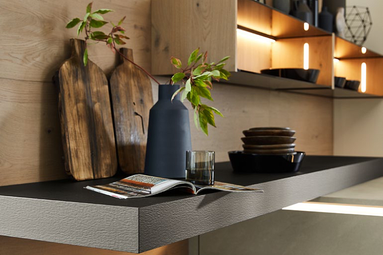 Какое стильное сочетание: настоящий цемент PORTLAND sapphire grey вместе с классическим дубом TAVOLA pinot создают особенно элегантную и впечатляющую фигуру с видом качества. Открытый стеллаж со стеклянными полками и подсветкой — экстравагантная изюминка. Со столешницей из цемента sapphire grey кухонный остров, кажется, вылеплен из одной формы, а выделенные приподнятые духовки одновременно привлекают внимание и практичны.