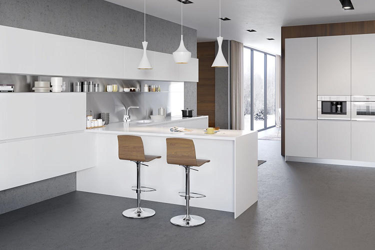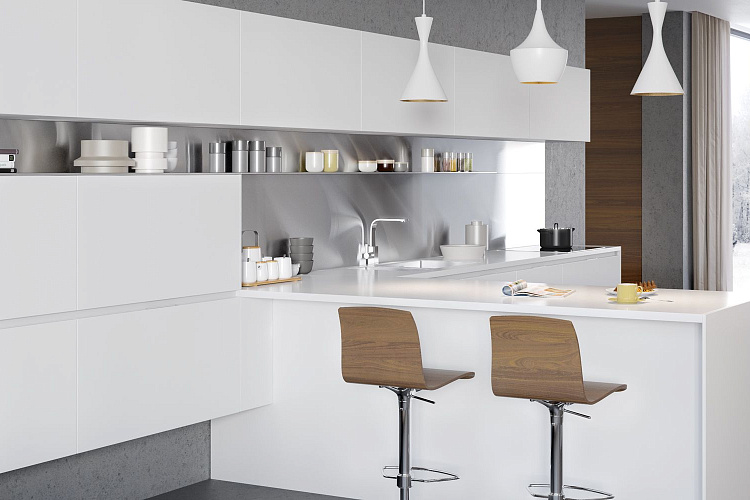 Дизайн кухни рационален и практичен. Все подчинено функции. Это самая демократичная кухня в модельном ряду компании. Это проект в стиле минимализм. Цветовая гамма пластиков сдержанна и выверена. Привлекательная цена делает модель хитом продаж для молодых семей. Полки и стеллажи из сотового алюминия, выглядят очень легко и изящно. Такие модули хорошо вписываются в современный интерьер любого помещения и подчеркивают интеграцию кухни в смежное жилое пространство. Для тех, кто хочет сделать кухню контрастной и внести в нее элементы экодекора, предлагаются пластики разных цветов и с различной структурой дерева и камня. Фасады щитовой конструкции из ДСтП, облицованной пластиком или из нержавеющей стали. Витрины рамочной конструкции из алюминиевого анодированного профиля.