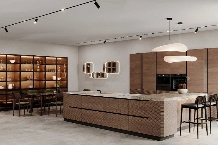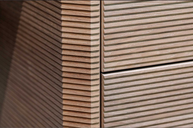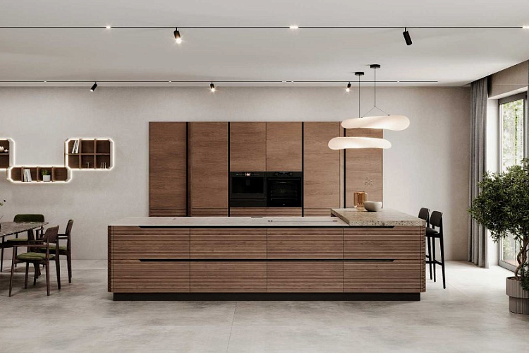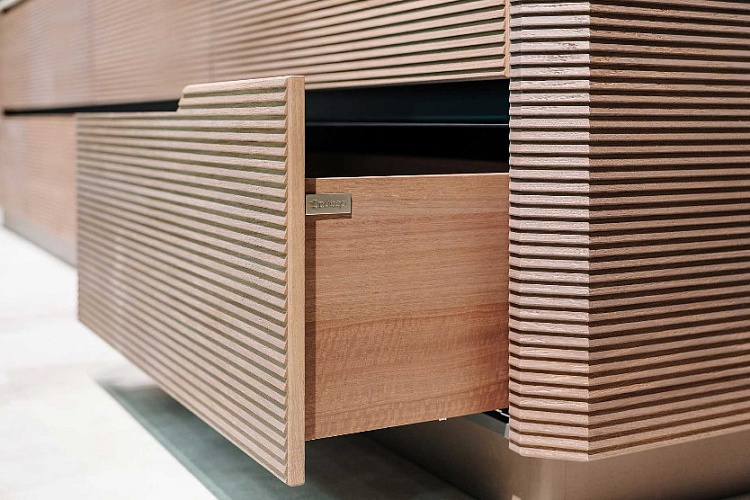 Почувствуйте магию пустыни. Фасады кухни «DUNE» с мощным рельефом шпона и уникальной горизонтальной фрезеровкой в точности повторяют завораживающий рисунок песчаных дюн. Игра света и теней на их поверхности создает невероятный объем и динамику, наполняя пространство энергией и стилем. Это совершенная форма, вдохновленная силой природы.
