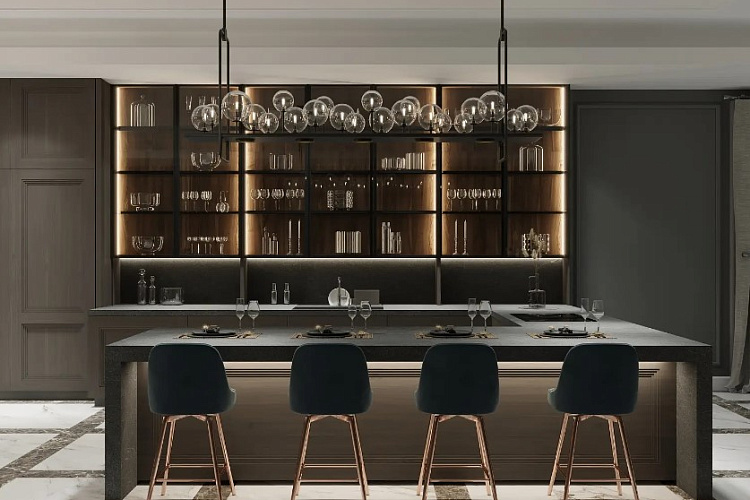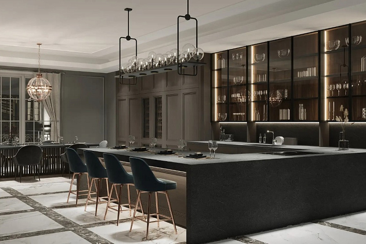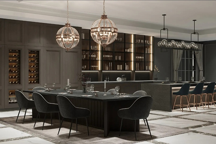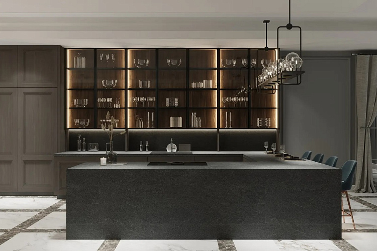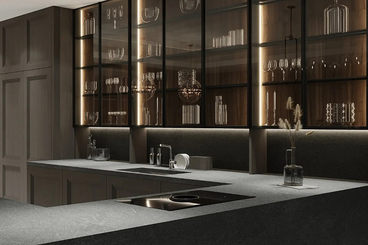 Кухня Garda от компании Virs воплощает элегантность и солидность. Модель предлагает фасады из массива дерева или МДФ с выразительной многоступенчатой филенкой, которая особенно эффектно смотрится на крупных модулях. Эта кухня идеально подходит для просторных помещений в загородных домах или квартирах с большой площадью.