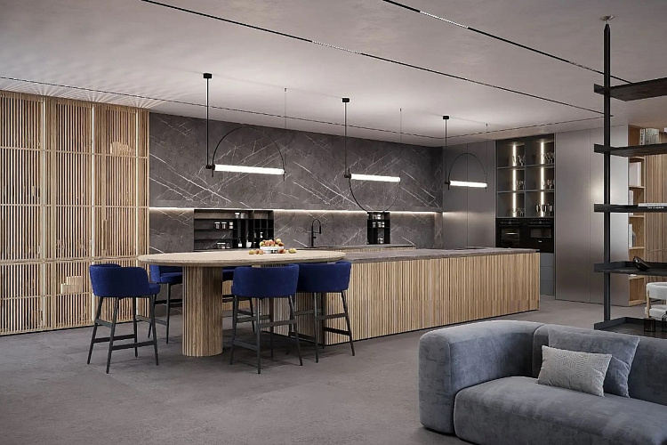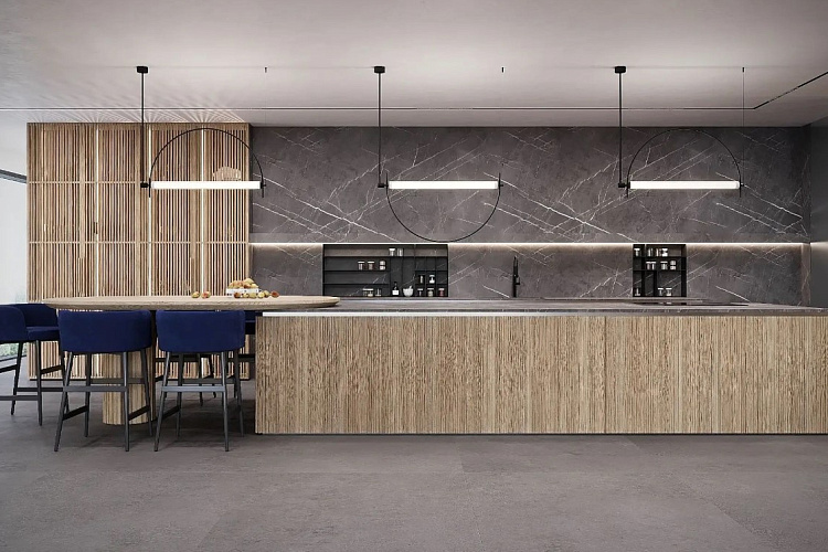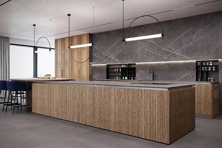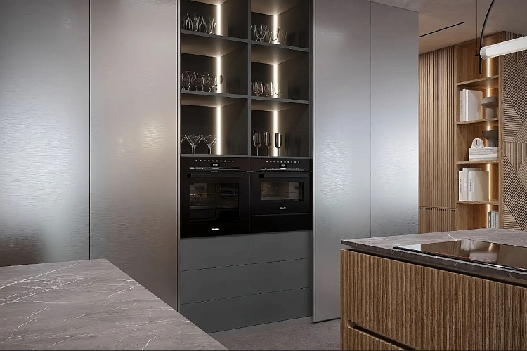 В данной композиции реечные фасады из шпона натурального дуба сочетаются с металлизированными поверхностями и горизонтальными ручками-дистанционарами в отделке «сталь». Столешница и раздвижная стеновая панель выполнены из керамики, что подчеркивает современную эстетику. Проект дополняют стеновые панели с разнонаправленными рейками, сохраняющие единую стилистику Grafika.