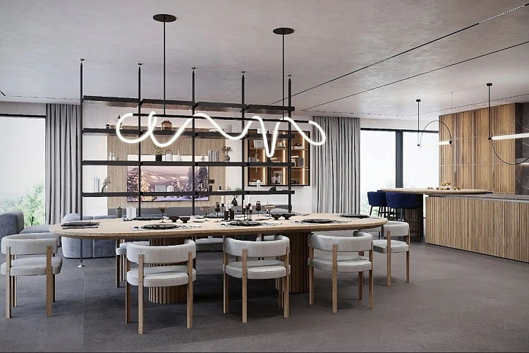 Модель позволяет объединить кухню, столовую и гостиную в единое пространство: в зоне столовой витражные алюминиевые фасады чередуются с реечными, а стеллаж деликатно разделяет зоны. Кроме того, в стилистике Grafika возможно изготовление межкомнатных дверей для полной гармонии интерьера.