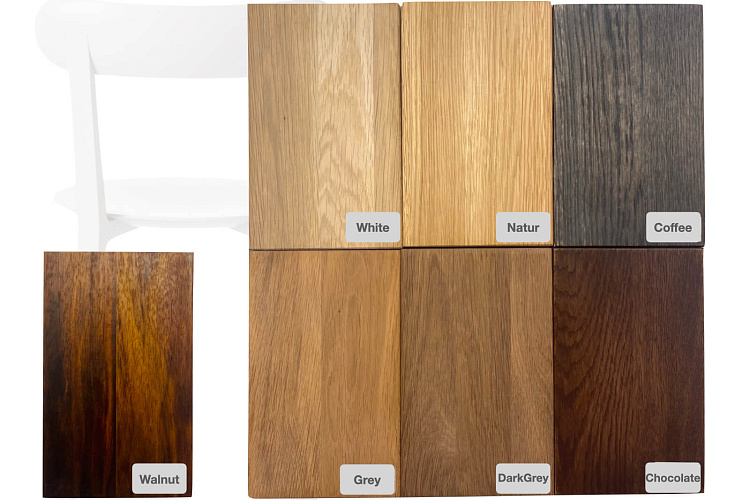 Изделия из дуба обработаны маслом, чтобы показать красоту дизайна из массива дерева. Используются натуральные органические компоненты- льняное масло и натуральный воск. Более сложные цвета такие как Dark Grey достигаются применением пигментированных масел (в случае темных оттенков - обработкой паром).