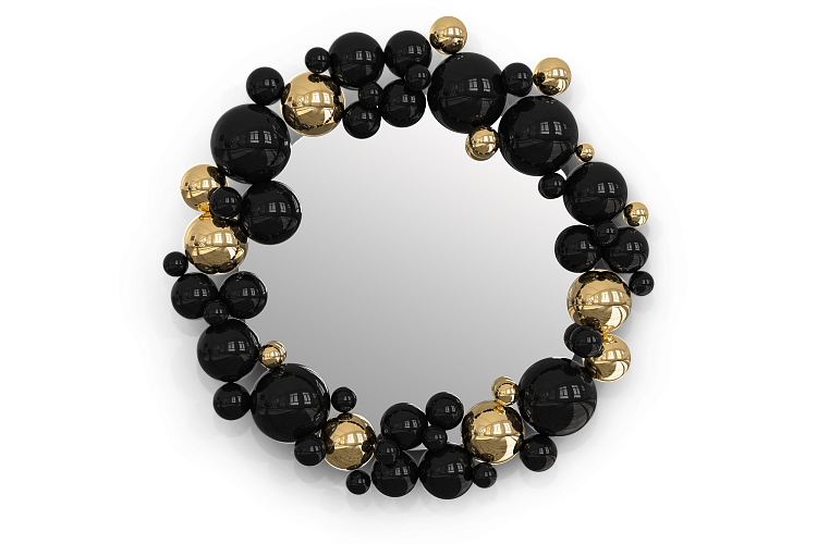 Дизайнерское зеркало Newton от BOCA DO LOBO — роскошный арт-объект, созданный в Португалии с использованием древней техники литья по металлу. Черно-золотая композиция из сфер и полусфер, покрытая эффектным лаком, формирует динамичный узор, отражающий свет в уникальной манере.