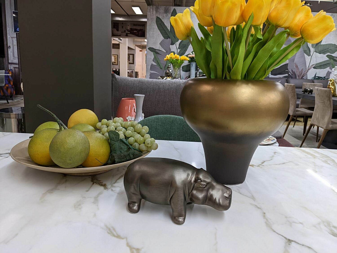 Дизайнерские предметы декора из Италиии славятся своей нетривиальной самобытностью. Так и создания ADRIANI&ROSSI имеют своё, нетипичное обывательскому глазу выражение. Скульптуры серии «БЕГЕМОТ» — очаровательные итальянские аксессуары, обеспечивающие одновременно уют и причудливость эклектичной гостиной. Изготовленные из керамики, бегемоты покрыты глянцевой эмалью цвета античного золота. Эти предметы входят в небольшую коллекцию бегемотов разных цветов, среди которых выделяются: насыщенная фуксия, благородный бордовый, сияющий графит и жизнерадостный апельсиновый. Бегемот — поистине один из самых опасных хищников в Африке. Статуэтка отделана состаренной эмалью, что позволяет ей оставаться предметом декора Италии вне времени. Оцените насколько филигранно рука итальянского дизайнера передает неуловимые элементы фигуры - это истинный шедевр, ювелирная работа. Начиная от носа и заканчивая кончиком хвоста скульптура сделана с поразительной четкостью, точными пропорциями и анатомическим соответствием. Невероятно красивый окрас бегемота заставляет постоянно в него всматриваться и трогать, потому что он одним своим видом напоминает скульптуру, к которой обязательно нужно прикоснуться и загадать желание. А вся мощь этого животного, пусть и в уменьшенном размере, говорит о том, что исполнение любых желаний ему по плечу. Существует даже мнение, что если потереть статуэтку бегемота за ушком, то в жизни будет сопутствовать любовь и удача. А также это животное привносит в дом мир, здоровье и новые знакомства. С таким тотемом человек просто наслаждается жизнью без хлопот, забот и прочих удручающих историй. Согласно Фэн-шуй, бегемоты подходят в качестве подарка для семейных пар, путешественников и очень жизнерадостных людей. Бегемот символизирует наслаждение обычной жизнью, выискивание радости во всех её проявлениях. Размер L23 P10 H12. Материал: керамика. Бренд Adriani & Rossi был создан в 1994 году Стефано Адриани. Adriani & Rossi специализируется на объектах декора интерьера жилых помещений, интерьерных салонов, выставочных, офисных и других пространств. В 2011 году бренд получил Золотой Компас - важнейшую премию в мире в сфере дизайна.