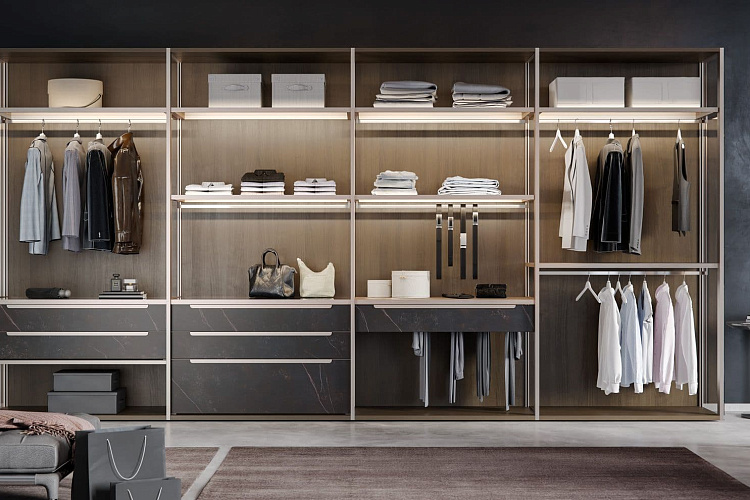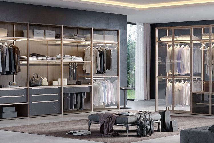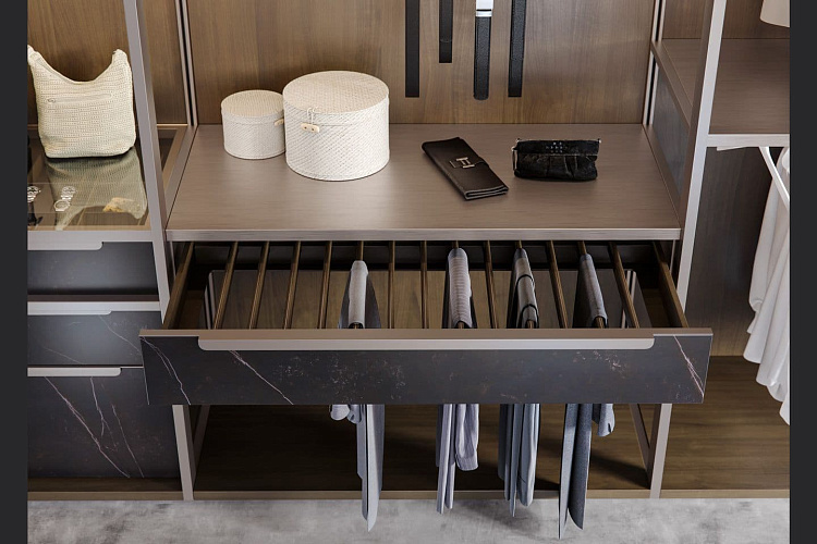 Logic Space — это новое дизайнерское прочтение пространства для хранения Ваших вещей. Архитектурную концепцию создает металл нового «теплого» бронзового цвета, поддерживаемый природной красотой керамических поверхностей фасадов выдвижных ящиков и задними панелями Fronda, имитирующими древесину «черного» дуба. Стеклянный «шкаф-остров» — новейшее изобретение в дизайне гардеробов. Легкий, изящный и независимый — идеальное решение рационального использования площадей свободных от стен.