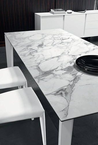 Керамика Calligaris производится при соединении керамогранитной плиты с закаленным флоат-стеклом. В результате получается поверхность с исключительными характеристиками устойчивости к царапинам, ударам, пятнам, термическим и химическим воздействиям. Она легко чистится и абсолютно гигиенична: не впитывает жидкости и не выделяет вредных веществ.