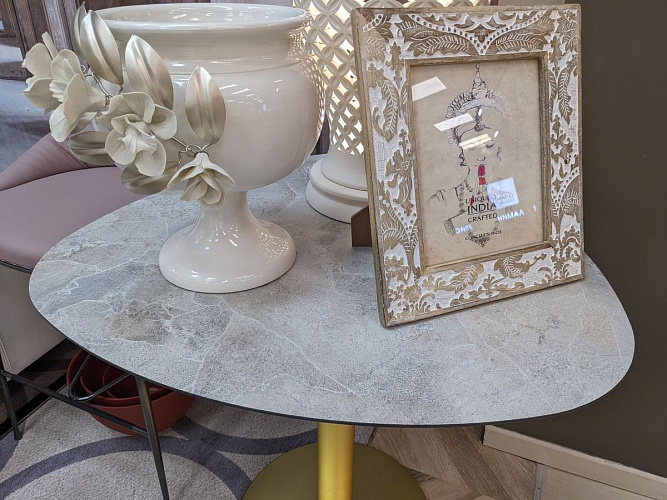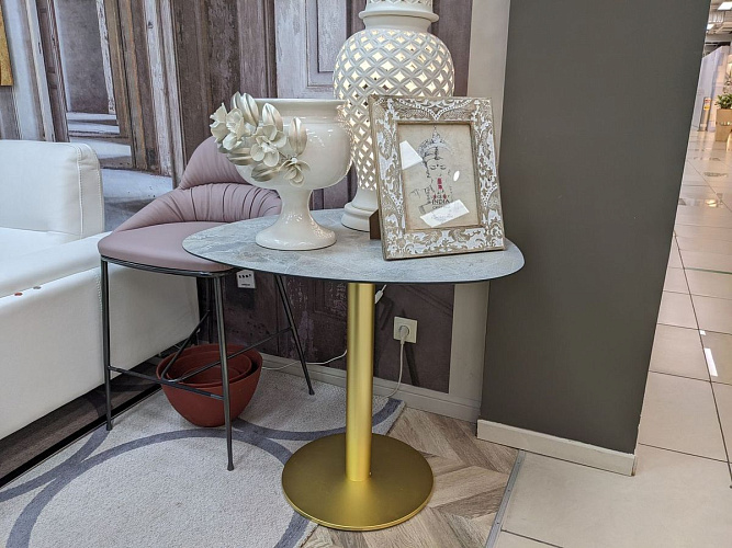 Металлическое основание в золотой отделке выгодно украшает столик.