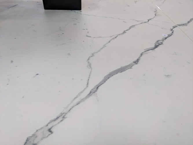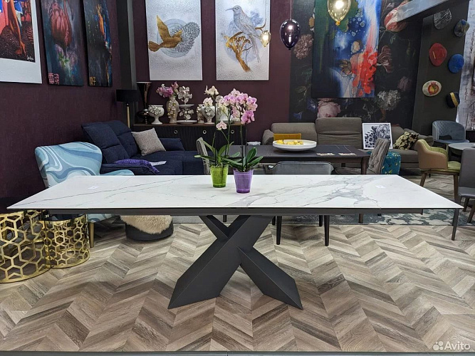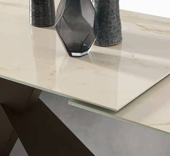 Раскладной стол на дерзком и стильном металлическом основании. Глянцевая керамическая столешница, имитирующая натуральный мрамор светлого цвета раскладывается в одну или две стороны без прикладывания усилий.