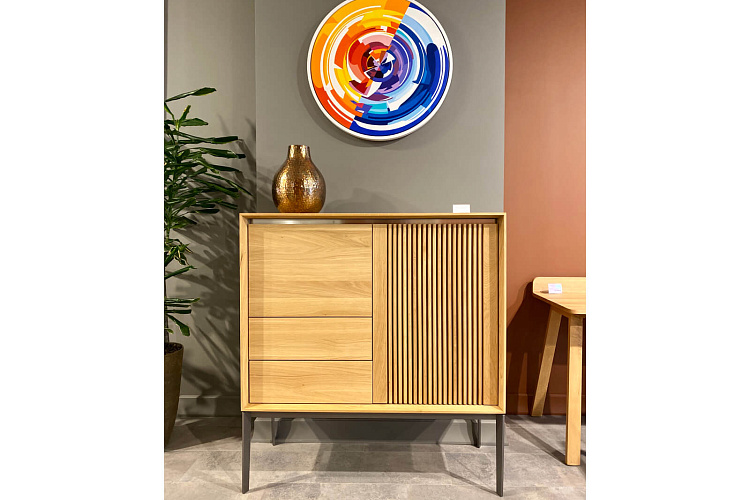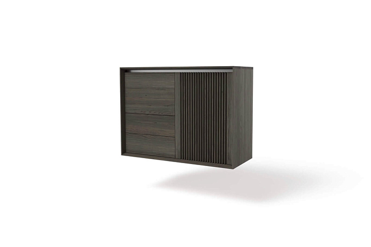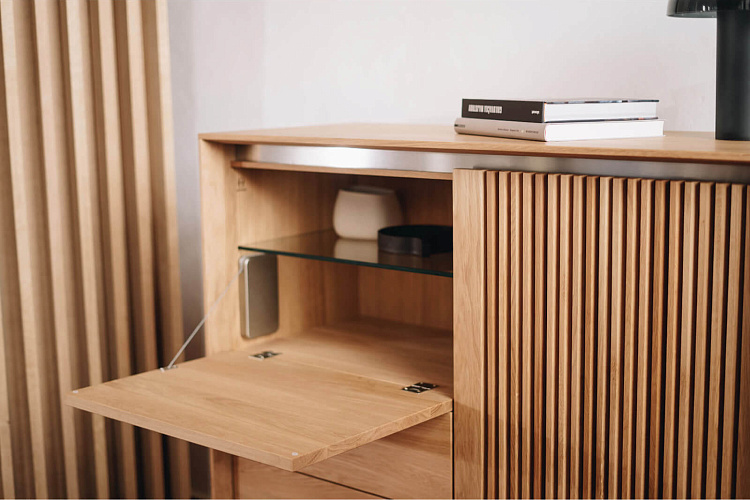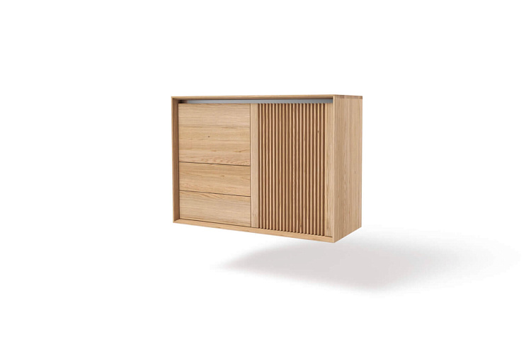Современный взгляд с вниманием к каждой детали. Это комод LINK+, который вы можете выбрать в виде подвесной системы или разместить его на ножках из нержавеющей стали. Вертикально оформленный комод из модельной линейки LINK+ может также использоваться, например, как барный шкаф или как небольшой домашний офис. В правой части он имеет открывающуюся «ламельную» дверцу, а в левой части привлекает откидной дверцей и двумя ящиками с системой открывания push.