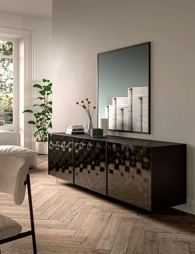 Дизайн: Luca Roccadadria На создание тумбы SARAH с ее зеркальными фасадами дизайнера вдохновила игра света на поверхности воды. Тумба эффектно заполняет пространство чарующими линиями, с переливами и волнами, дарующими бесконечные отражения. Тумба доступна в двух высотах. Основание может быть как стеклянное, так и металлическое. L148,5 P50 H72 История бренда Ozzio начинается в 1961 году в колыбели лучших из лучших итальянского дизайна: регион Brianza к северу от Милана. На своем первом ремесленном производстве семья Pozzoli культивировала прежде всего понятие качества. С этой философией и на своей собственной фабрике бренд растет и развивается вплоть до сегодняшнего дня, когда это уже интернациональная компания, представленная своей продукцией на всех 5 континентах. Коллекция Ozzio это своеобразная интерпретация современного образа жизни, результат видения и сбора мировых тенденций и трансформация их с уже присущим итальянским стилем.