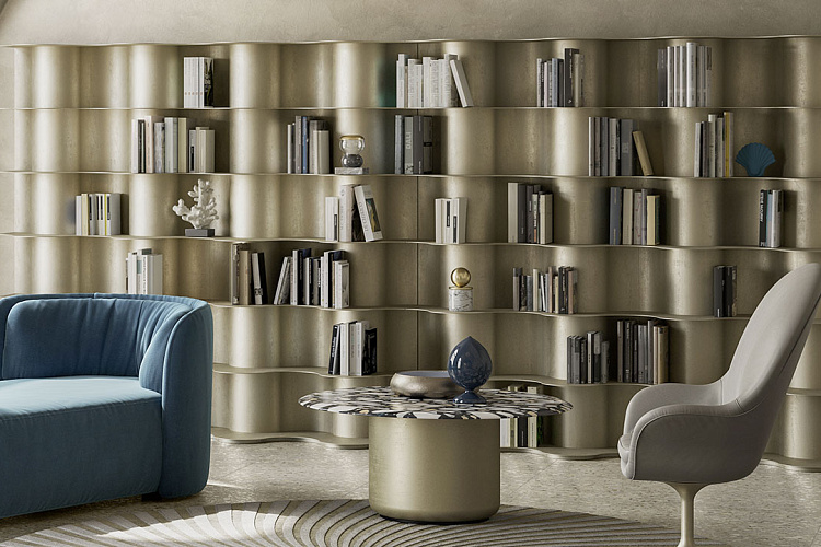 Книжный шкаф Tide с глянцевым светло-золотистым покрытием и извилистыми формами способен преобразить гостиную, придав ей динамику и элегантность.