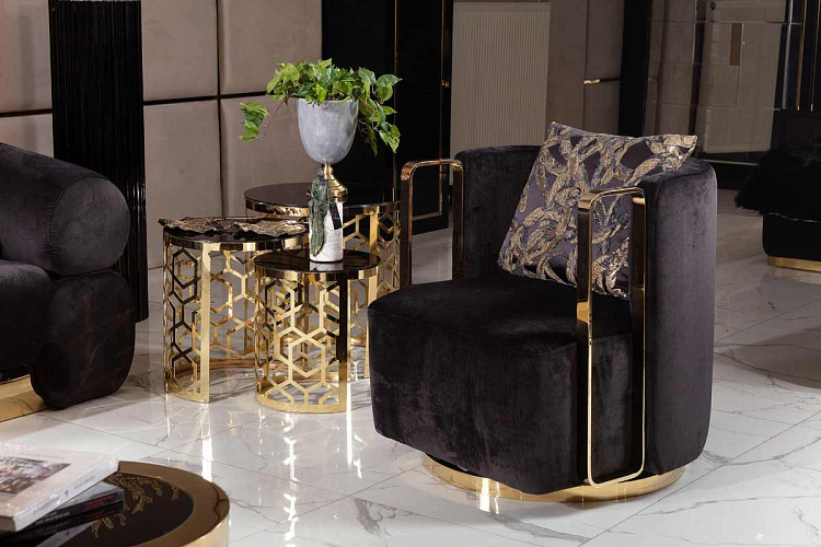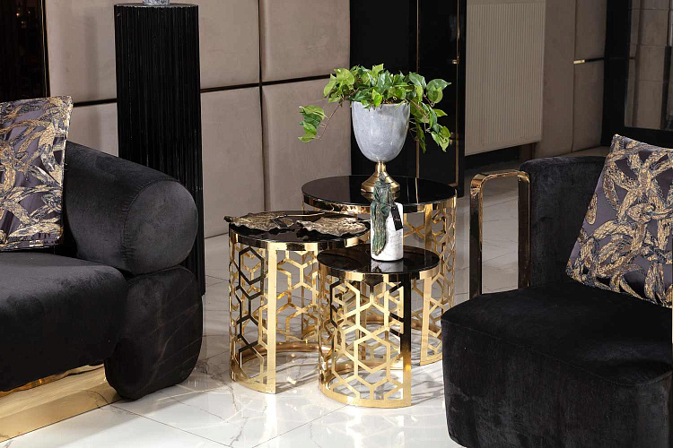 Набор из трех кофейных столиков из стекла и латуни. Столики могут стоять по отдельности или быть сгруппированными в единую композицию.