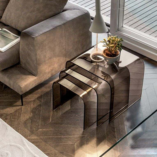 100% Made in Italy. Высокий уровень. Коллекция My Home. Комплект из трех столиков из закаленного стекла бронзового, дымчатого, экстрапрозрачного или прозрачного цвета. Мебельная фабрика Tonin Casa основана в 1975 году итальянцем Gianni Tonin, который и сегодня стоит во главе компании. В начале восьмидесятых фабрика выпускает каталог своей первой классической коллекции, которая быстро завоевывает внутренний рынок сочетанием традиционного итальянского стиля и функциональностью. В девяностых годах классическую линейку дополняет современная коллекция, ставшая визитной карточкой компании и сделавшая мебель от Tonin Casa легко узнаваемой среди массы безликой современной мебели. Сегодня Gianni Tonin уже вместе со своим сыном Nicola Tonin - продолжателем мебельной династии и дизайнером - создают новые коллекции и, как любой модный дом с мировым именем, выпускают каждый год очередные шедевры мебельного искусства, демонстрируя их на выставках Милана, Нью-Йорка, Парижа и Москвы. Именно стремление производить качественную и стильную дизайнерскую мебель и воплотить в каждом предмете и аксессуаре функциональную роскошь покорило сердца покупателей в Европе и Америке.