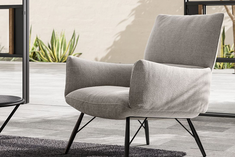 Высокий комфорт модели обеспечивается благодаря продуманной поясничной поддержке и изящной обволакивающей спинке на удлинённых металлических опорах. Тканевая версия кресла предлагается на выбор с однотонной или контрастной кожаной отделкой, подчёркивающей его ретро-стилистику.