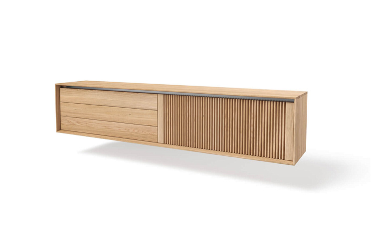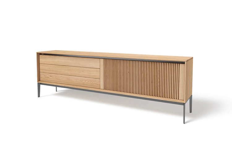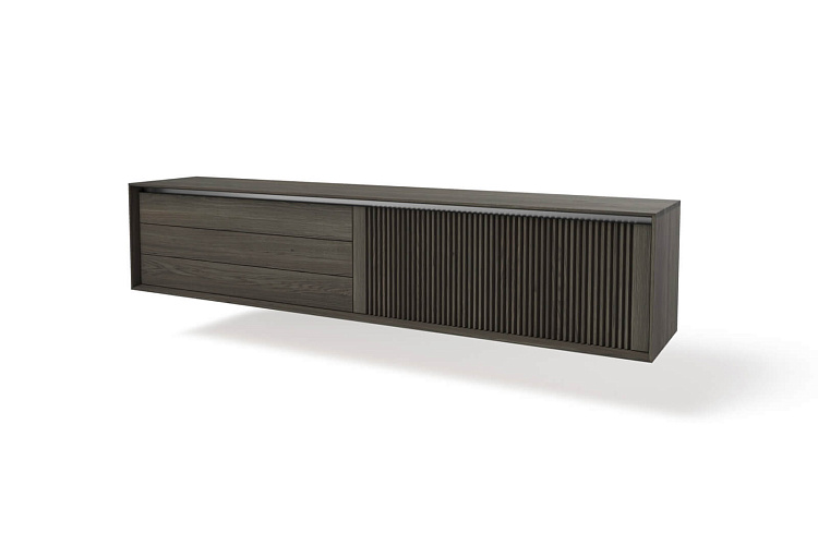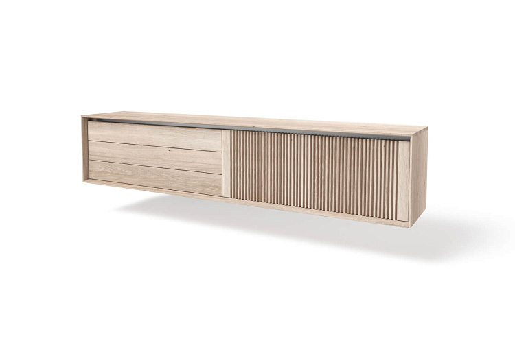 Современный взгляд с вниманием к каждой детали. Это современный комод LINK +/ LN3Z238, который можно использовать в качестве тв-тумбы, заказать его как подвесную систему или поставить на ножки из нержавеющей стали. Распашная дверь состоит из наклонно фрезерованных и соединенных вертикально ламелей, а в левой части расположены три больших ящика с системой открывания нажатием "Push-to-open".