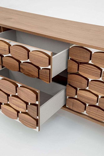 100% Made in Italy. Высокий уровень. Коллекция Design Couture. Замысловатый узор на фасадах, игра структуры дерева и отблески зеркала контрастируют и создают гармонию. Концепция пчелиных сот лежит в основе тумбы Honey. Творение мастеров Tonin Casa сфокусировано на дизайне 50-х годов. Каркас и соты возможны в отделках белый матовый, орех и темный дуб. Дизайн от Nicola Tonin. Мебельная фабрика Tonin Casa основана в 1975 году итальянцем Gianni Tonin, который и сегодня стоит во главе компании. В начале восьмидесятых фабрика выпускает каталог своей первой классической коллекции, которая быстро завоевывает внутренний рынок сочетанием традиционного итальянского стиля и функциональностью. В девяностых годах классическую линейку дополняет современная коллекция, ставшая визитной карточкой компании и сделавшая мебель от Tonin Casa легко узнаваемой среди массы безликой современной мебели. Сегодня Gianni Tonin уже вместе со своим сыном Nicola Tonin - продолжателем мебельной династии и дизайнером - создают новые коллекции и, как любой модный дом с мировым именем, выпускают каждый год очередные шедевры мебельного искусства, демонстрируя их на выставках Милана, Нью-Йорка, Парижа и Москвы. Именно стремление производить качественную и стильную дизайнерскую мебель и воплотить в каждом предмете и аксессуаре функциональную роскошь покорило сердца покупателей в Европе и Америке.
