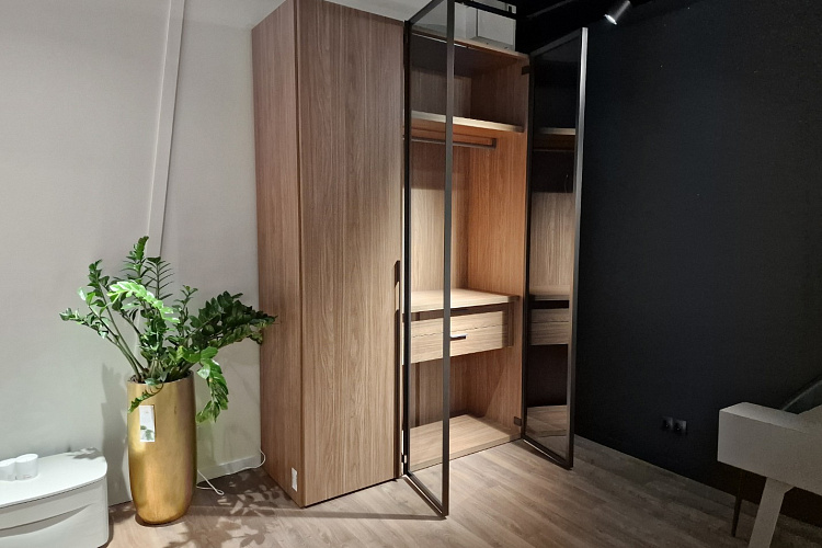 Armadi Metropolis оснащен двумя стильными дверцами Metropolis с затемненным стеклом, которые добавляют нотку таинственности и подчеркивают современный дизайн. Для большей практичности один модуль шкафа скрыт за глухой фасадной дверью.