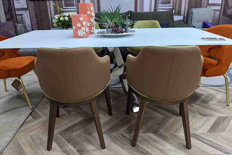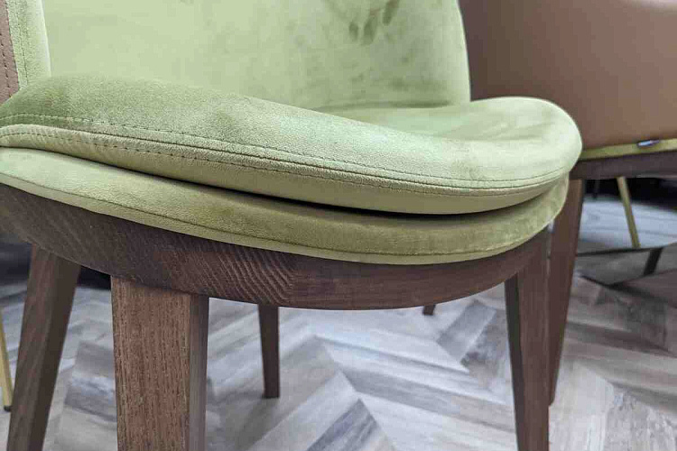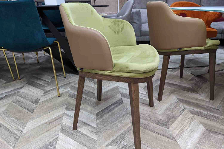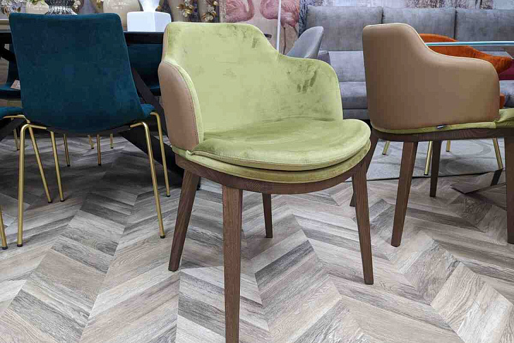 Стул с подлокотниками на деревянном основании. Каркас изготовлен из массива ясеня. Гнуто-клееная фанера в основании сиденья формирует закругленную форму. Пенополиуретан способствует мягкости и комфорту, а комбинированная обивка из велюра и экокожи делают стул красивым и удобным в эксплуатации. Сиденье стула оснащено дополнительной подушкой. Размер L55 P58 H78 В наличии 4 штуки.
