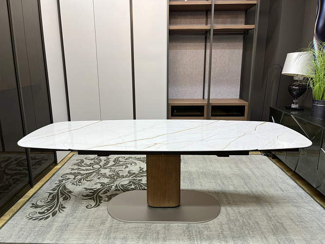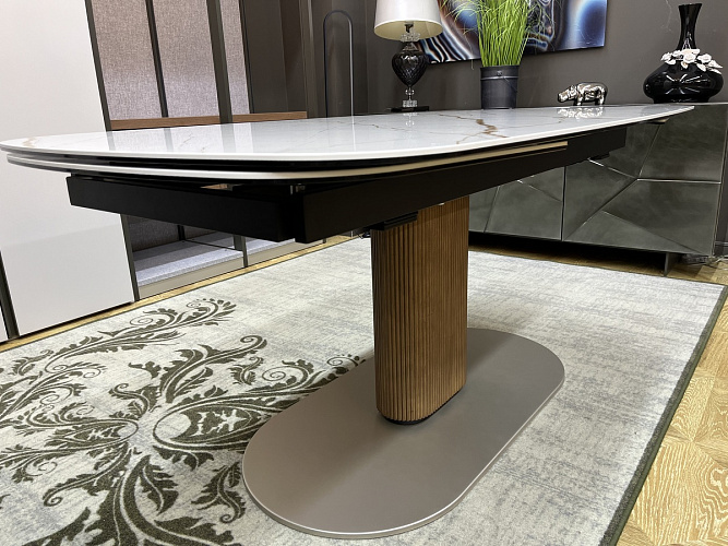Шикарный стол в стиле Арт Деко в основе дизайна которого лежит идея овала. Овальная раскладная столешница вторит силуэту центральной колонны, которая не только обеспечивает устойчивость, но и позволяет максимально использовать пространство под столешницей.