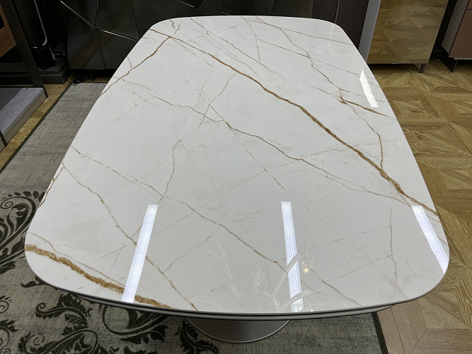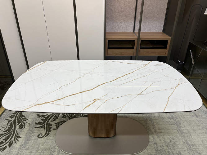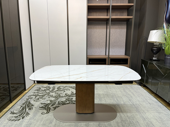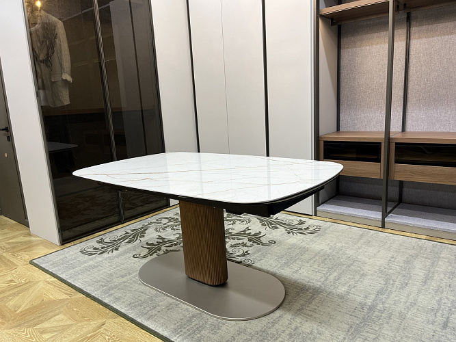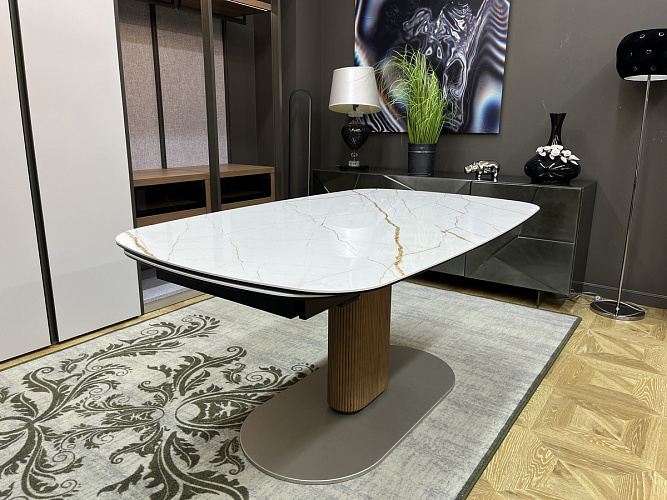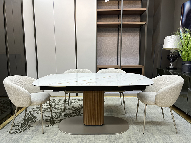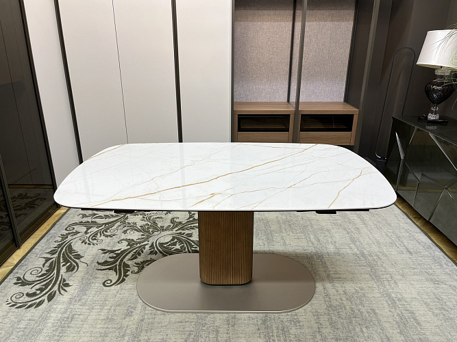Столешница с двумя боковыми вставками по 48 см из керамики легко раскладывается, увеличивая длину на одну или две вставки.