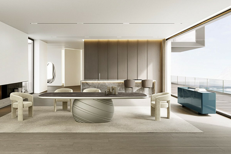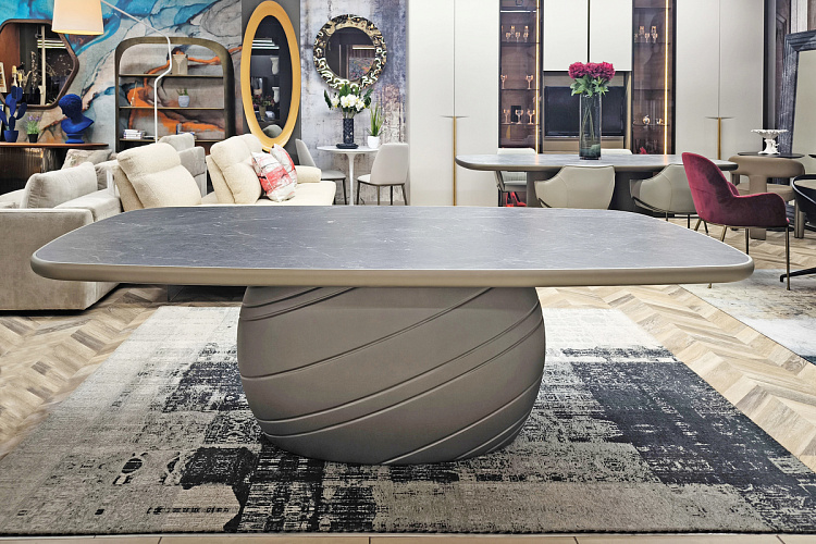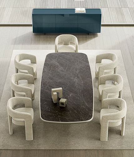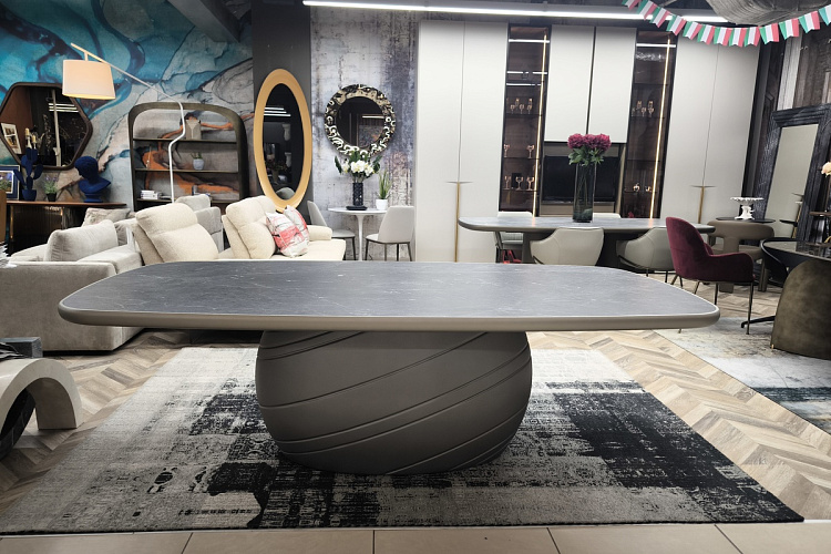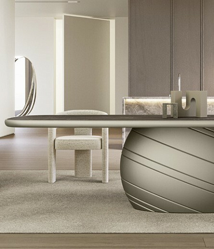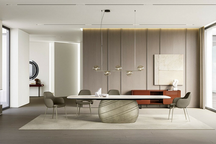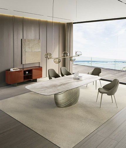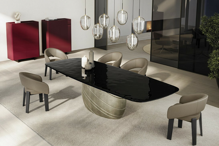 Дизайн Andrea Lucatello. Итальянский дизайнерский стол от бренда Eforma. Создавая стол Giove, дизайнер Andrea Lucatello вдохновлялся светящейся планетой Юпитер - самой большой в солнечной системе. В западной астрологии Юпитер ассоциируется с процветанием и удачей. Основание стола, изготовленное из цемента и покрытое металлизированными отделками, декорировано параллельными профилями и воспроизводит картину необыкновенно красивой планеты, появляющейся на небосклоне и отражающей солнечный свет. Стол комплектуется различными вариантами столешниц, в том числе керамической, деревянной, стеклянной и мраморной. Наиболее элегантно и изысканно стол смотрится со столешницей в исполнении King, когда край оформлен деревянным кантом, окрашенным в тон основания. EFORMA Бренд Eforma - это настоящий оплот высококачественной итальянской мебели, за которой стоят вековые традиции. Мастера компании - наследники ремесленного мастерства Северо-Восточного итальянского региона Венето, знатоки своего дела, умеющие сделать бесценные предметы мебели, благодаря наилучшим материалам, тщательной обработке и бережного отношения к каждой детали. В этом и выражается совершенство «Made in Italy». Именно истории профессионалов Eforma и синергия различных навыков позволяют создавать особенные продукты, ценные еще на стадии процесса своего рождения. От кожи до роскошных материалов, от элегантных мраморных поверхностей до металлических с новейшим стилем - внимание к мастерству имеет главенствующую позицию, имеющую устойчивое стремление к обновлению: таким образом, мастерство преобразует традицию в повод приблизиться к будущему. Вся мебель Eforma производится исключительно руками мастеров на заводах в Тьене согласно принципам заботы о людях и природе. Идеология Eforma выделяет своей главенствующей ролью способность создавать единственные в своем роде продукты, совершенствующие интерьер, с помощью внимательности к дизайну и безупречному пошиву. Бренд уверен, что только чувственность может открыть безграничный творческий мир, позволяющий родиться безопасным и качественным продуктам. Продукция Eforma демонстрирует совершенство Made in Italy благодаря точному исполнению и особому вниманию к деталям. Столы, серванты, стулья и многое другое полностью изготавливаются вручную с использованием самых лучших материалов и покрытий. Провокационный дизайн и мастерство исполнения делают предметы, которые будут сопровождать вас в повседневной жизни, уникальными. Благодаря постоянному диалогу между традициями и инновациями ремесленный опыт превращается в идею, которая смотрит в перспективу. Коллекции Eforma обогащают мебельный интерьер, соблюдая оригинальный стиль интерьера. Именно из единства ценностей, таких как гармония, утонченность и искусство, рождаются продукты Eforma.