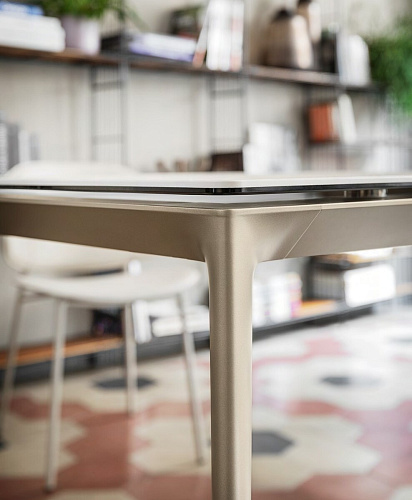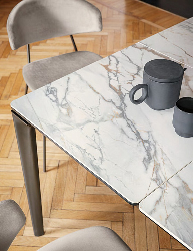 Керамика Calligaris производится при соединении керамогранитной плиты с закаленным флоат-стеклом. В результате получается поверхность с исключительными характеристиками устойчивости к царапинам, ударам, пятнам, термическим и химическим воздействиям. Она легко чистится и абсолютно гигиенична: не впитывает жидкости и не выделяет вредных веществ.