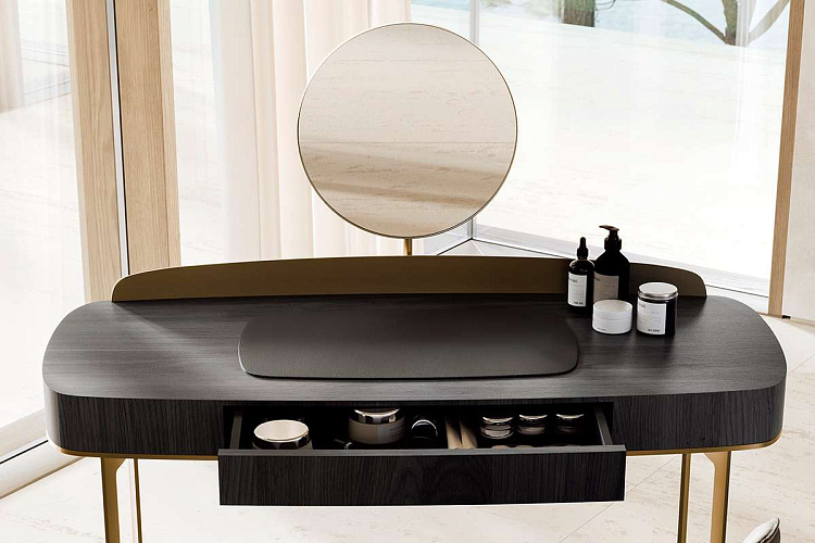 Lyra VANITY- это элегантный туалетный столик с зеркалом: прекрасный предмет интерьера для оформления классической зоны для косметических процедур в спальне в современном стиле. Туалетный столик оборудован очень удобным зеркалом .Спроектированный дизайнером Ollen Pal, Lyra VANITY выполнен с выдвижным ящиком по центру, имеет в основе металлический каркас и украшен металлическим бортиком. Шпонированная столешница эффектно обрамлена металлическим кантом в цвете бронза.. Деревянный верх поддерживают изящные, изогнутые металлические ножки. Особый шарм столу придает металлический бортик. Этот элегантный предмет интерьера может быть использован и как письменный стол. EFORMA Бренд Eforma - это настоящий оплот высококачественной итальянской мебели, за которой стоят вековые традиции. Мастера компании - наследники ремесленного мастерства Северо-Восточного итальянского региона Венето, знатоки своего дела, умеющие сделать бесценные предметы мебели, благодаря наилучшим материалам, тщательной обработке и бережного отношения к каждой детали. В этом и выражается совершенство «Made in Italy». Именно истории профессионалов Eforma и синергия различных навыков позволяют создавать особенные продукты, ценные еще на стадии процесса своего рождения. От кожи до роскошных материалов, от элегантных мраморных поверхностей до металлических с новейшим стилем - внимание к мастерству имеет главенствующую позицию, имеющую устойчивое стремление к обновлению: таким образом, мастерство преобразует традицию в повод приблизиться к будущему. Вся мебель Eforma производится исключительно руками мастеров на заводах в Тьене согласно принципам заботы о людях и природе. Идеология Eforma выделяет своей главенствующей ролью способность создавать единственные в своем роде продукты, совершенствующие интерьер, с помощью внимательности к дизайну и безупречному пошиву. Бренд уверен, что только чувственность может открыть безграничный творческий мир, позволяющий родиться безопасным и качественным продуктам. Продукция Eforma демонстрирует совершенство Made in Italy благодаря точному исполнению и особому вниманию к деталям. Столы, серванты, стулья и многое другое полностью изготавливаются вручную с использованием самых лучших материалов и покрытий. Провокационный дизайн и мастерство исполнения делают предметы, которые будут сопровождать вас в повседневной жизни, уникальными. Благодаря постоянному диалогу между традициями и инновациями ремесленный опыт превращается в идею, которая смотрит в перспективу. Коллекции Eforma обогащают мебельный интерьер, соблюдая оригинальный стиль интерьера. Именно из единства ценностей, таких как гармония, утонченность и искусство, рождаются продукты Eforma.
