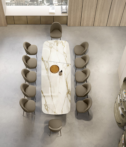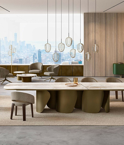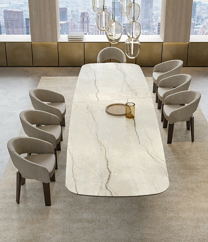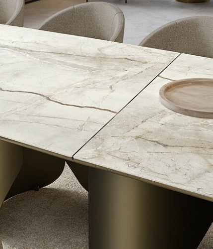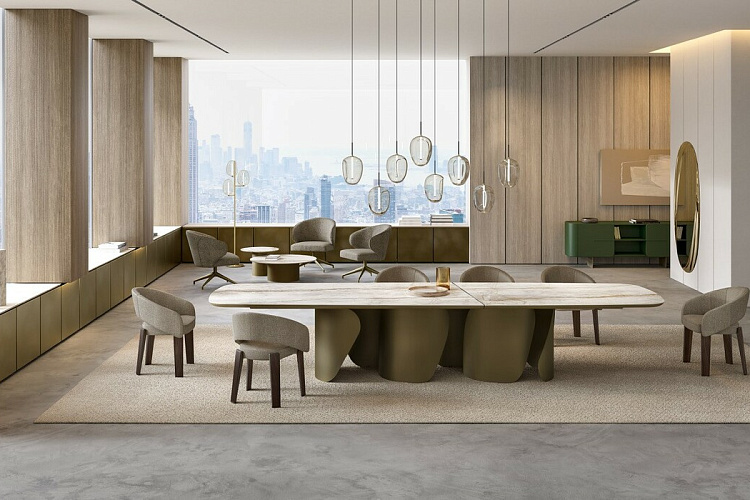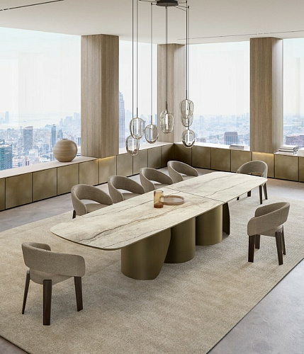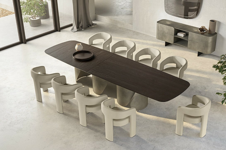 Итальянский дизайнерский стол от бренда Eforma в размере XL. Design Nello Palomba. Итальянский стол Onda компании Eforma позволяет оценить основание целиком, предлагая различные визуальные переходы в зависимости от угла, с которого на него смотрят. Onda - это элегантный стол для современной гостиной. Его выдержанный стиль основан оригинальной металлической базой округлых форм. База формируется гнутыми листами, количество которых и форма зависят от размера стола. Это креативное основание является опорой для изысканной, но в тоже время решительной столешницы из керамогранита, стекла, мрамора или натурального дерева. В варианте круглого стола возможна комплектация поворотным подносом Lazy Susan для того, чтобы сделать стол Onda неоспоримым героем Ваших лучших моментов. В 2025 году на выставке в Милане была представлена новая версия столешниц в размере XL. Столешница, изготовленная из керамики или дерева, состоит из двух частей и скрепляется диагональным металлическим профилем, которые несет не только функциональный смысл, но является и стильным элементом, украшающим стол. EFORMA Бренд Eforma - это настоящий оплот высококачественной итальянской мебели, за которой стоят вековые традиции. Мастера компании - наследники ремесленного мастерства Северо-Восточного итальянского региона Венето, знатоки своего дела, умеющие сделать бесценные предметы мебели, благодаря наилучшим материалам, тщательной обработке и бережного отношения к каждой детали. В этом и выражается совершенство «Made in Italy». Именно истории профессионалов Eforma и синергия различных навыков позволяют создавать особенные продукты, ценные еще на стадии процесса своего рождения. От кожи до роскошных материалов, от элегантных мраморных поверхностей до металлических с новейшим стилем - внимание к мастерству имеет главенствующую позицию, имеющую устойчивое стремление к обновлению: таким образом, мастерство преобразует традицию в повод приблизиться к будущему. Вся мебель Eforma производится исключительно руками мастеров на заводах в Тьене согласно принципам заботы о людях и природе. Идеология Eforma выделяет своей главенствующей ролью способность создавать единственные в своем роде продукты, совершенствующие интерьер, с помощью внимательности к дизайну и безупречному пошиву. Бренд уверен, что только чувственность может открыть безграничный творческий мир, позволяющий родиться безопасным и качественным продуктам. Продукция Eforma демонстрирует совершенство Made in Italy благодаря точному исполнению и особому вниманию к деталям. Столы, серванты, стулья и многое другое полностью изготавливаются вручную с использованием самых лучших материалов и покрытий. Провокационный дизайн и мастерство исполнения делают предметы, которые будут сопровождать вас в повседневной жизни, уникальными. Благодаря постоянному диалогу между традициями и инновациями ремесленный опыт превращается в идею, которая смотрит в перспективу. Коллекции Eforma обогащают мебельный интерьер, соблюдая оригинальный стиль интерьера. Именно из единства ценностей, таких как гармония, утонченность и искусство, рождаются продукты Eforma.