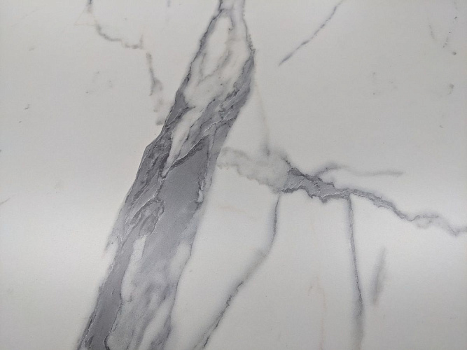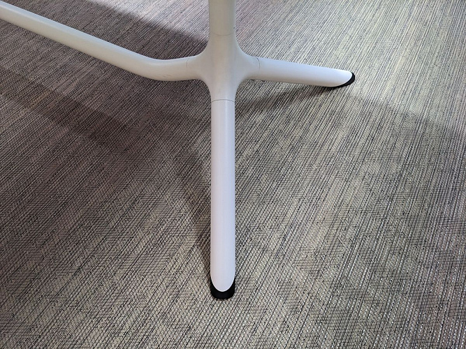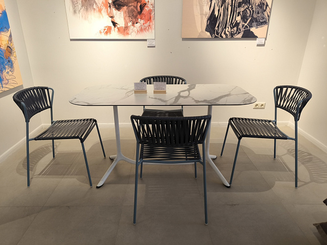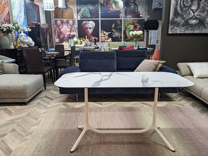 Ламинированная столешница с тонкими краями стилистически идеально подходит сдвоенному изящному металлическому основанию.