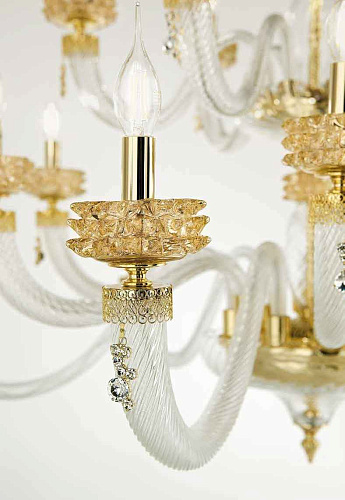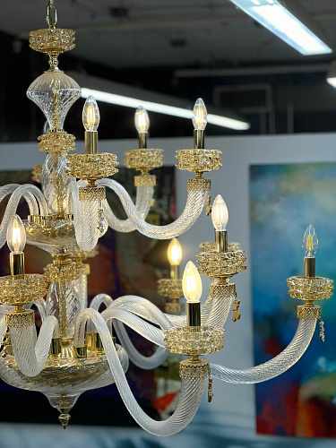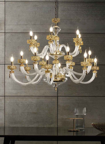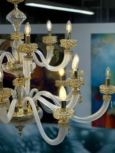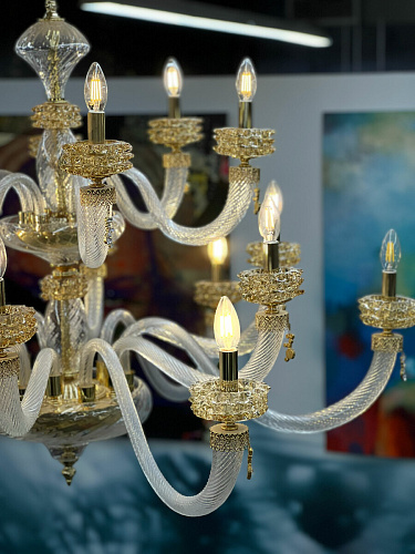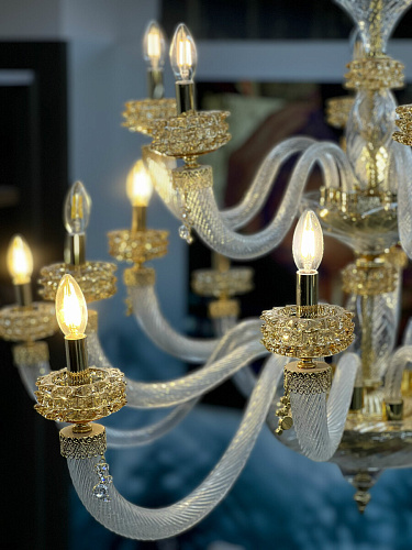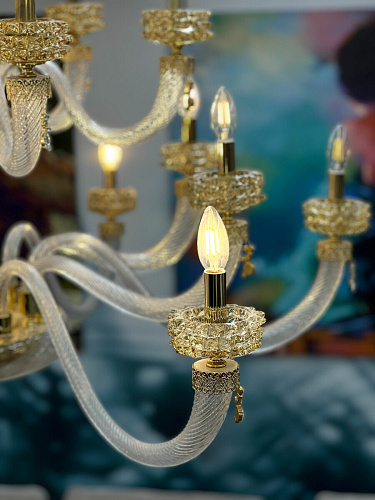 Шикарная двухъярусная люстра на 18 рожков из Муранского прозрачного стекла с элементами из стекла янтарного цвета. Линейка люстр и светильников ANAIS от итальянского бренда Lux Illuminazione представляет собой воплощение истинной роскоши и элегантности, где каждая деталь создана с любовью и мастерством. Изготовленные вручную, эти люстры являются настоящими произведениями искусства, достойными самых изысканных интерьеров. Легкость и прозрачность каскадов напоминает струящийся фонтан, а роскошные кристаллы, сверкающие в основании каждого рожка, добавляют композиции особую изысканность. Декоративные подвески, похожие на капли воды, усиливают чувство движения и жизни. Металлический каркас и фурнитура, выполненные в сияющем золотом или глубоком темном серебре, дополняются разнообразием оттенков выдувного стекла и кристаллов. Палитра включает в себя такие тона, как прозрачная лазурь, медовый, чайная роза, фуме (насыщенный тёмно-серый оттенок) и полностью прозрачный, что позволяет создавать уникальные сочетания, соответствующие любому интерьерному решению. Свет — это драгоценность, подаренная глазам. История бренда Lux Illuminazione - это история 100% Made in Italy. Группа Ciciriello берет начало в 80-х годах прошлого века. Giovanni Ciciriello, как основатель компании, обладая дальновидными предпринимательским взглядами, заложил первый кирпичик бренда, передавая свои мечты и проекты своим детям., которые еще в юном возрасте берут на себя руководство, тем самым привнося в традиции дух инноваций. Lux Illiminazione - это воплощение итальянского вкуса и ремесленного искусства. Ценности, на которых основывается бренд - это самые лучшие мастера, творчество и отбор высококачественных и дорогих материалов. Внимание к деталям, следование традициям и интеграция в современный дизайн характеризуют продукцию от Lux Illuminazione как настоящий итальянский стиль. Отделка: Trasparente - Miele - Oro lucido Clear - Honey - Bright gold Lampadario 12+6 luci 12+6 lights chandelier 18 x E14 max 40w 230v Размер: D 125 H 130 Если дом обставлен дорогостоящей мебелью, то источником света должно быть, если не само солнце, то близкое ему по значимости - светило. История бренда Lux Illuminazione - это история 100% Made in Italy. Группа Ciciriello берет начало в 80-х годах прошлого века. Светильники от итальянской фабрики Lux Illiminazione создаются настоящими профессионалами своего дела вот уже более 20 лет. Giovanni Ciciriello, как основатель компании, обладая дальновидными предпринимательским взглядами, заложил первый кирпичик бренда, передавая свои мечты и проекты своим детям., которые еще в юном возрасте берут на себя руководство, тем самым привнося в традиции дух инноваций. Lux Illiminazione - это воплощение итальянского вкуса и ремесленного искусства. Ценности, на которых основывается бренд - это самые лучшие мастера, творчество и отбор высококачественных и дорогих материалов. Внимание к деталям, следование традициям и интеграция в современный дизайн характеризуют продукцию от Lux Illuminazione как настоящий итальянский стиль. Идеальное сочетание итальянских традиций с инновациями - главное кредо компании Lux Illiminazione. Выбор материалов является результатом тщательного отбора среди лучших на рынке: кристаллы Scholer , лиможский фарфор, стекла муранских мастеров и высококачественная латунь. Фабричные заготовки искусно обрабатываются ремесленниками фабрики, на изделия вручную наносится золотая, серебряная фольга 