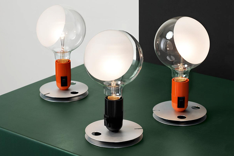 Настольная лампа Lampadina Led с основанием из алюминия и патроном белого цвета. Лампа с прозрачным шаром частично подвергается пескоструйной обработке для рассеивания света. Дизайн: Achille Castiglioni.