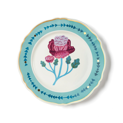 Обеденная тарелка Geranio из коллекции Botanica. Фарфоровая тарелка с деколью и золотой каймой. Подходит для посудомоечной машины до 250 циклов, не подходит для микроволновой печи. Голубой фарфор. Диаметр 26.5 см. Дизайн: Monika Forsberg.