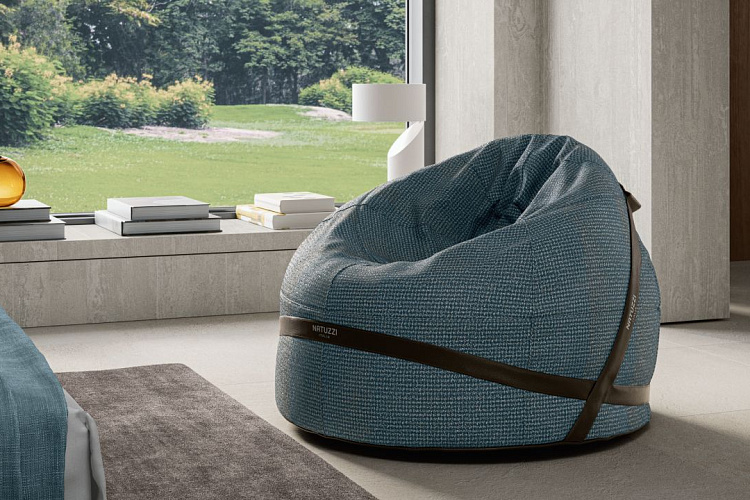 Его конструкция адаптируется к форме тела, обеспечивая уютное расслабление. Отличительная деталь — кожаный ремень, который обхватывает пуф, выполняя также роль удобной ручки для переноски.
