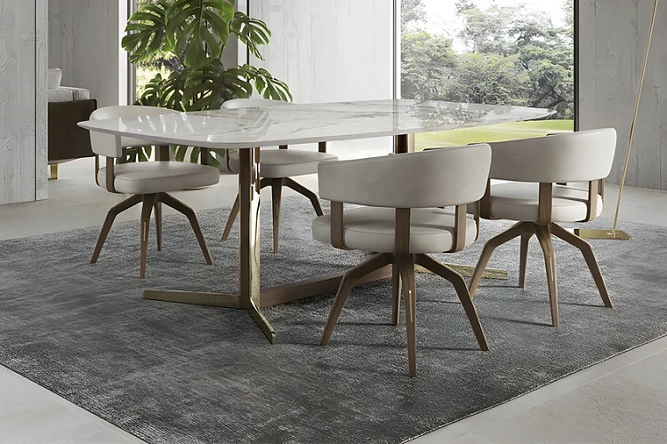 Отделка спинки и подлокотников подчеркивает лаконичность и изысканность стиля. Модель оснащена центральной опорой на поворотном механизме и ножками из цельного дерева, что обеспечивает мобильность и универсальность использования — как в домашнем интерьере, так и в гостиничных номерах.