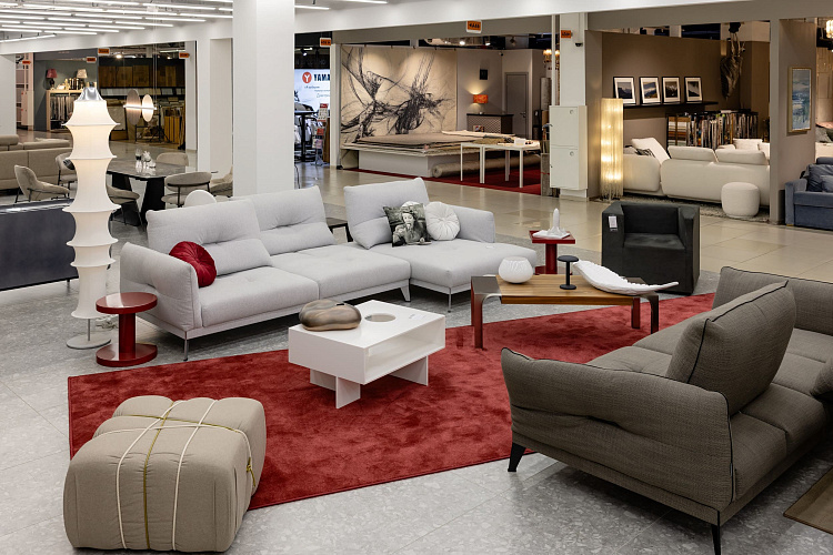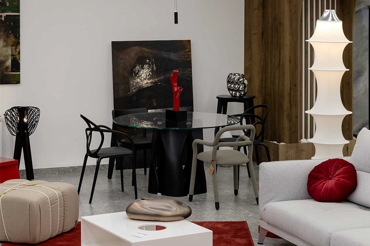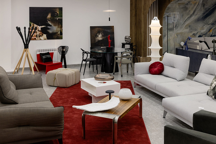 Диваны от Saiwala добавляет в интерьер трендовые биоморфные формы. Стол с необычным отсеком для хранения от Settees совмещает функциональность и креативность. Дополняет мебельную группу сервировочный столик-тележка из ассортимента Mondo Interior.