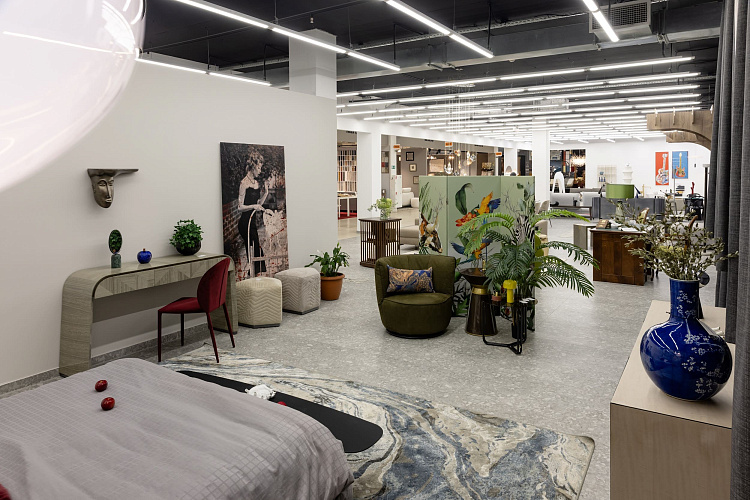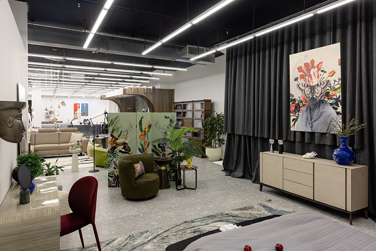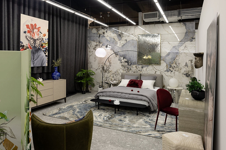 Настоящий «оазис личной жизни», в котором лаконичная базовая мебель от салонов Mondo Interior и Duval дополнена яркими акцентами, стену украшает большое зеркальное панно, а персональная лаунж-зона расположилась прямо посреди импровизированных джунглей с красочной ширмой и светильниками от салона Delight.